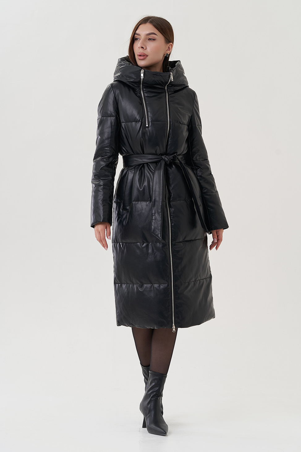 Женский пуховик из эко кожи с капюшоном (чёрный)