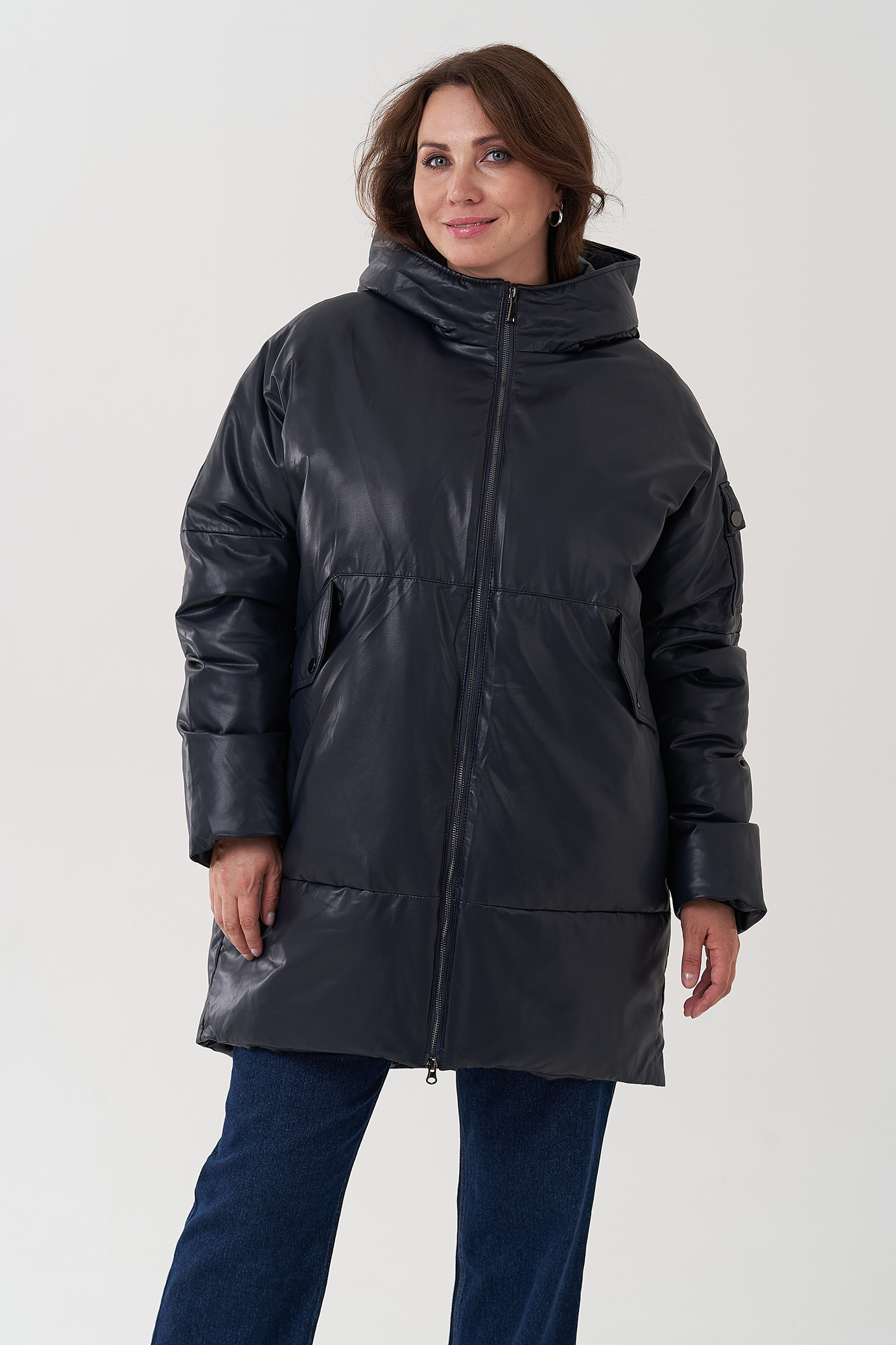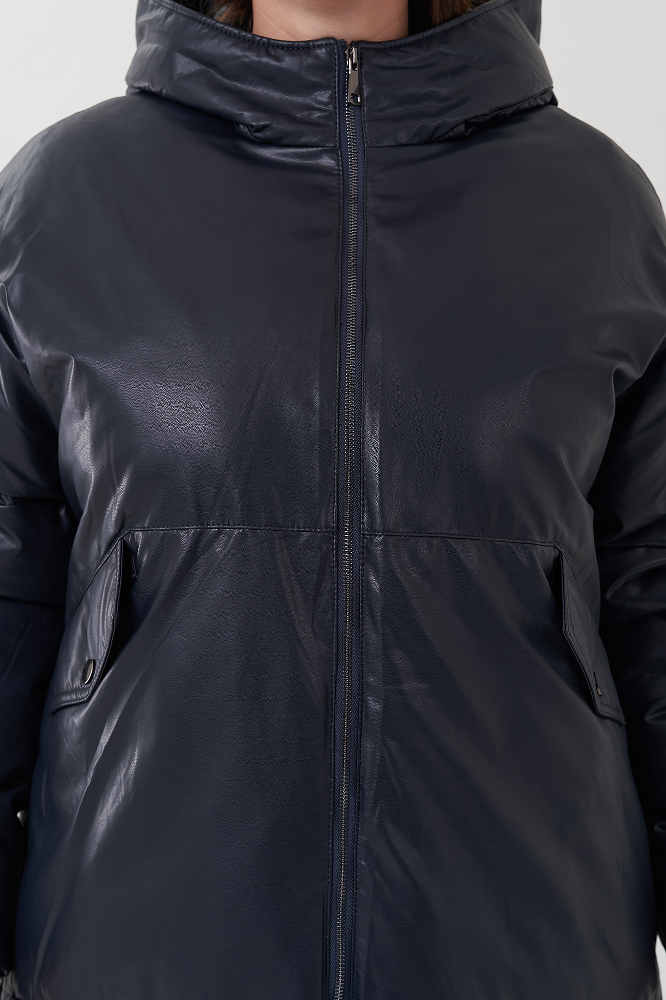 Женский пуховик синего цвета из эко кожи (синий)